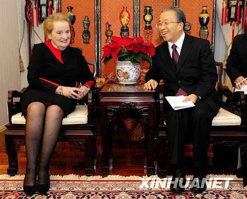 12月13日,在美國(guó)首都華盛頓,正在美國(guó)進(jìn)行工作訪問(wèn)并舉行中美戰(zhàn)略對(duì)話的國(guó)務(wù)委員戴秉國(guó)(右)會(huì)見(jiàn)美國(guó)前國(guó)務(wù)卿奧爾布賴(lài)特。新華社記者張巖攝