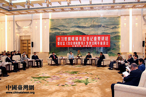 中國臺灣網1月4日北京消息 臺盟中央、全國臺聯4日上午在人民大會堂舉行學習胡錦濤總書記重要講話暨紀念《告臺灣同胞書》30周年座談會。