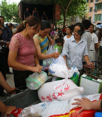 資料圖片:2008年5月28日,青川縣城居民在發放點領取救濟糧。自5月28日起,四川青川縣對因地震造成的無房可住、無生產資料和無收入來源的困難群眾實施臨時生活救助,救助標準為每人每天10元、0.5公斤成品糧,“三孤”人員的補助標準為每人每月600元,救助期限為3個月。 新華社發(劉忠俊 攝)