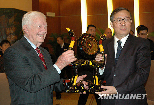 1月14日晚,卡特接受湖北省省長李鴻忠(右)贈送的紀念品。當日,美國前總統卡特一行抵達武漢,在中國人民對外友好協會副會長李小林的陪同下,參觀了位于湖北紅安的李先念紀念園。新華社記者 魏夢佳 攝