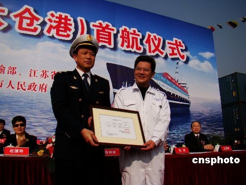 二00八年十二月十五日上午,裝滿集裝箱的“天福”輪一聲長鳴,太倉港至臺(tái)灣港航線從此告別繞道日本石垣島的歷史,直接駛向臺(tái)灣。首航前,江蘇海事局副局長韋之杰向“天福”輪曲延杰船長鄭重頒發(fā)了船舶直航臺(tái)灣出口許可證。 中新社發(fā) 丁梅 攝
