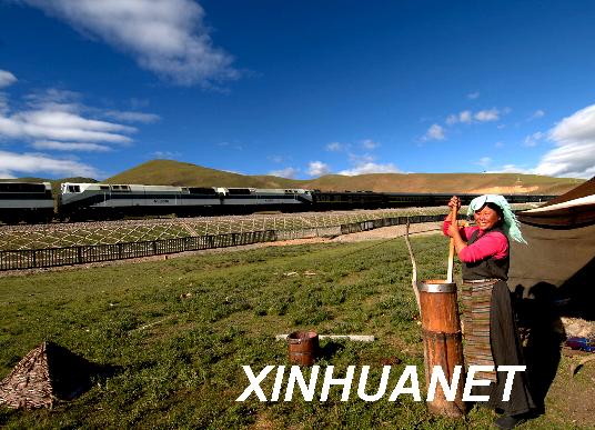 一列火車行駛在藏北牧場邊(2006年7月20日)。7月8日,世界上海拔最高、凍土線路最長的鐵路――青藏鐵路正式通過國家驗收,施工質量、環境保護等各項指標符合要求。新華社記者覺果攝