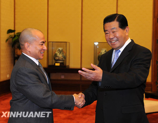 賈慶林歡迎西哈莫尼來華,高度評價柬埔寨王室對中柬關系發展作出的卓越貢獻。