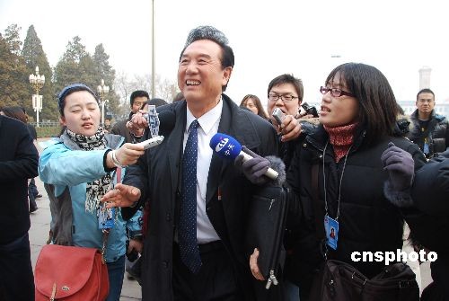 3月3日下午,海峽兩岸關系協會會長陳云林在人民大會堂前接受媒體采訪。 中新社發 韓海冰 攝