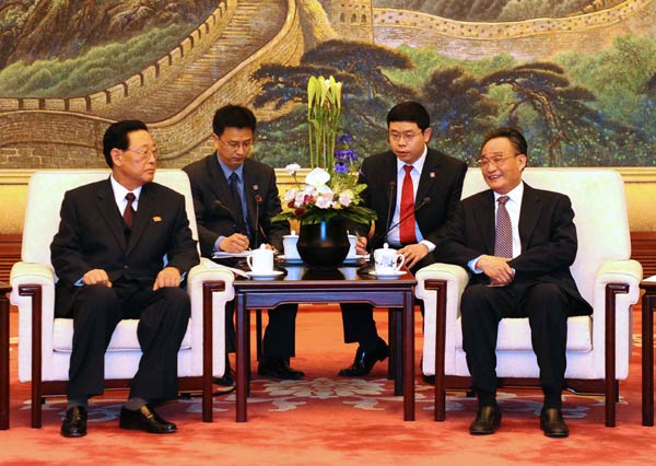 3月19日,全國人大常委會委員長吳邦國在北京人民大會堂會見朝鮮內閣總理金英日。(新華社記者李濤攝)