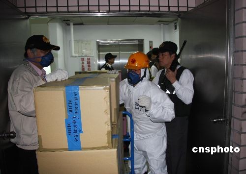 4月2日,臺灣“法務部”調查局在臺北市木柵垃圾焚化廠舉行獲案毒品銷毀作業,圖為調查局武裝人員監護卸下的獲案毒品運進焚化廠內的車間。 中新社發 耿軍 攝