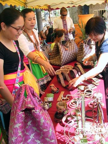 為迎接大陸居民赴臺旅游首發團,臺東少數民族在一年一度的豐年祭活動中,推出民族特色濃郁的手工藝品,吸引大陸客。圖為一北京首發團成員在選購當地少數民族的手工藝品。 中新社發 徐長安 攝
