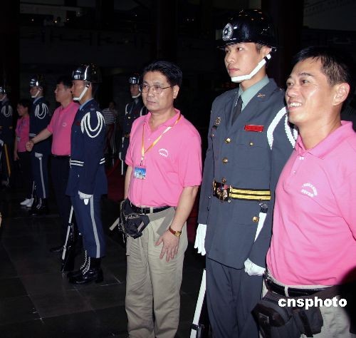 大陸居民赴臺旅游及兩岸周末包機7月4日成行。七百多人的首發團抵臺后,多個團甫抵臺北,首站即參訪臺北孫逸仙紀念館。為迎接大陸觀光客來臺,紀念館方面破例允許大陸觀光客可以近身和館內衛兵合影。 中新社發 徐長安 攝