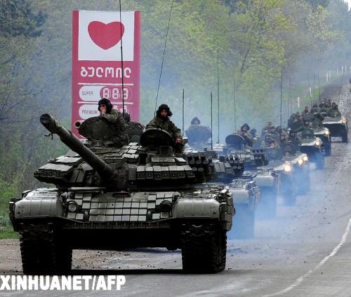 5月5日,在格魯吉亞首都第比利斯附近,格軍坦克向發生叛亂的穆赫羅瓦尼內務部隊軍營進發。格魯吉亞內務部5日宣布,格強力部門當天聯合挫敗一起由格高級軍官策劃的軍事叛亂,該叛亂旨在破壞即將于6日舉行的北約軍事演習,并推翻由總統薩卡什維利領導的現政權。 新華社記者郭群攝
