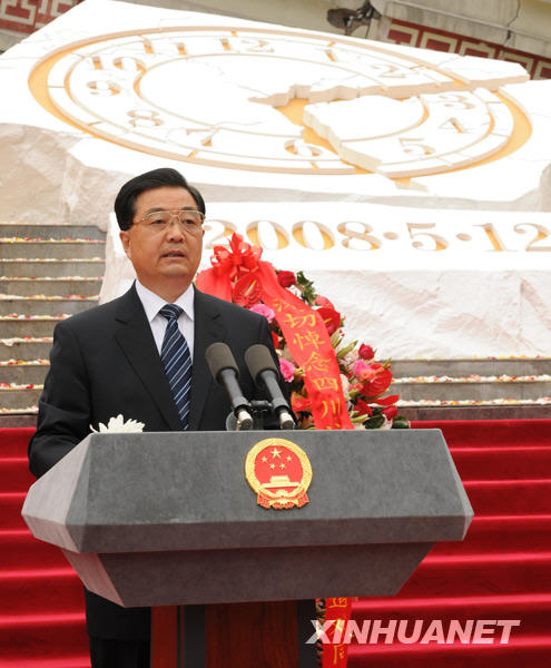 今天,我們在這里莊嚴集會,紀念四川汶川特大地震一周年,向在地震災害中不幸罹難的同胞們、向為奪取抗震救災斗爭重大勝利而英勇獻身的烈士們表達我們的深切思念。