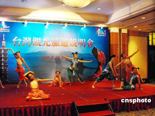 推介說明會上,來自臺灣“蘭陽舞蹈團”的中小學生還為與會者表演了極富臺灣民間色彩的舞蹈“偶戲”,并播放了臺灣風光宣傳片。