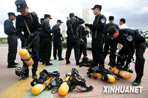 6月9日,特警在裝備防毒設備。新華社發(鄭煥松攝)
