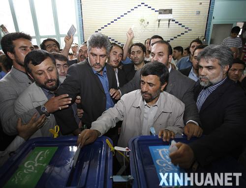 6月12日,伊朗現任總統艾哈邁迪-內賈德(前中)在德黑蘭參加總統選舉投票。伊朗第10屆總統選舉投票于當地時間12日上午8時(北京時間11時30分)開始,新總統將在現任總統艾哈邁迪-內賈德、前總理穆薩維、前議長卡魯比和前伊斯蘭革命衛隊總司令雷扎伊4名候選人中產生。新華社發