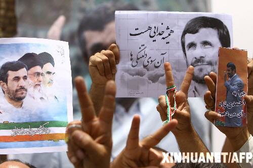 2009年6月13日 支持者慶祝艾哈邁迪-內賈德贏得伊朗總統選舉 6月13日,在伊朗宗教圣城庫姆街頭,現任總統艾哈邁迪-內賈德的支持者們舉著他的畫像,做出勝利的手勢。根據伊朗選舉委員會當日凌晨公布的數據,在已統計的94%的選票中,艾哈邁迪-內賈德贏得64.31%的選票,從而贏得伊朗總統選舉。 新華社/法新