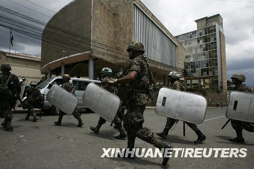 6月28日,在洪都拉斯首都特古西加爾巴,士兵抵達議會大樓。洪都拉斯議會正在此召開緊急會議,討論該國當前的政治形勢。洪都拉斯最高法院28日宣布對現任總統(tǒng)曼努埃爾·塞拉亞的罷免決定,并稱28日凌晨洪都拉斯軍方拘押及強行驅逐總統(tǒng)的行為合法。 新華社/路透