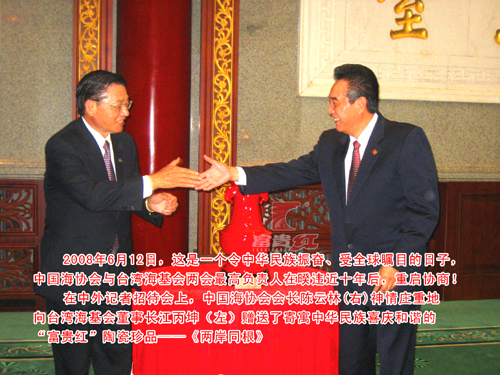 2008年6月12日,臺灣海峽交流基金會董事長江丙坤先生一行回中國大陸協商兩岸關系改善與發(fā)展,中國海峽會會長陳云林先生贈送的禮品為福建省富貴紅文化發(fā)展有限公司藝術總監(jiān)徐少東先生創(chuàng)作的富貴紅陶瓷藝術作品《兩岸同根》。相對于會談議題,似乎只是輕描淡寫的一次禮品互贈,但對于陶瓷業(yè)界來說卻引起了不小的轟動,引發(fā)了人們對陶瓷藝術品《兩岸同根》的關注。人們不禁會問:《兩岸同根》何以在這樣的一個高規(guī)格的、意義非同一般的兩岸對話中受到如此高的禮遇?其實,我們將余光中的《鄉(xiāng)愁》與徐少東的《兩岸同根》置放在一起進行比較的時候,兩者雖是以不同的語言載體進行表現的藝術作品,但我們仍然不難發(fā)現其中的緣由。
