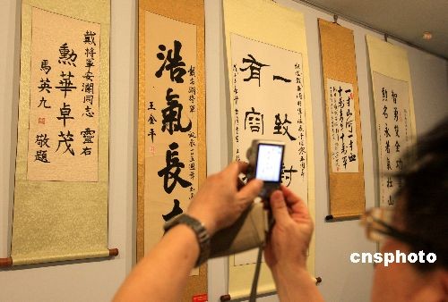 此外,中國國民黨主席吳伯雄親筆為本次書畫交流展題詞,臺灣“立法院長”王金平的“浩氣長存”,以及蔣孝嚴的“萬古流芳”等書法作品均被擺放在了顯眼的位置。另外,臺灣省臺北縣縣長周錫偉的“驍勇善戰 博學多才”、基隆市長張通榮的“筆力千鈞 名垂功勛”等均一并展出,其規?梢娨话。