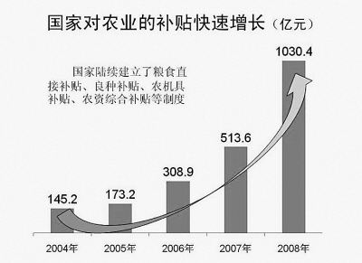 2004年開(kāi)始,先后對(duì)種糧農(nóng)民實(shí)施了直接補(bǔ)貼、良種補(bǔ)貼、農(nóng)機(jī)具補(bǔ)貼、農(nóng)業(yè)生產(chǎn)資料綜合直補(bǔ)政策。2009年,“四補(bǔ)貼”金額已達(dá)到1230億元。一減一加,農(nóng)民得到巨大實(shí)惠。