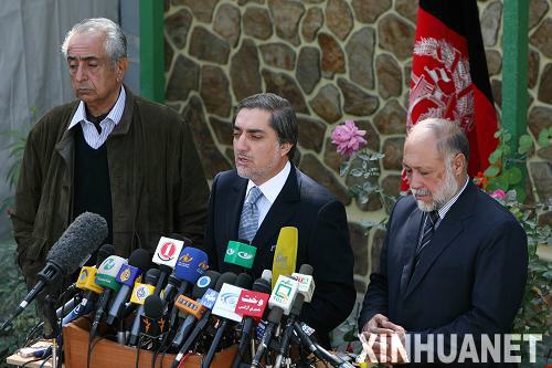 10月21日,阿富汗總統候選人阿卜杜拉(中)在阿富汗首都喀布爾出席新聞發布會。當天,阿卜杜拉宣布拒絕與現任總統卡爾扎伊組成聯合政府,并呼吁總統選舉第二輪投票堅持公平、公正。新華社發(扎比攝)