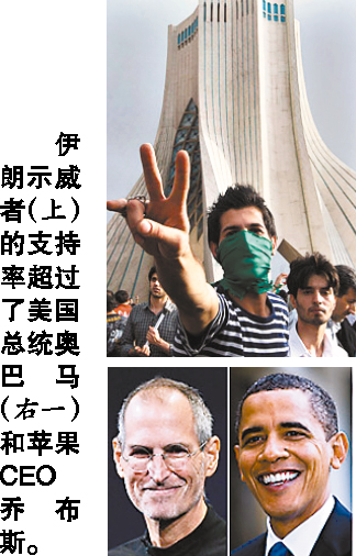 截至昨日,《時代》網站的公眾投票情況顯示,伊朗抗議者以91分的高支持度和72822張支持票暫列第一,并且將第二名美國總統奧巴馬遠遠拋在后面。后者的票數目前僅為24792,分數為55。以下為支持率排在前五名的候選人物。