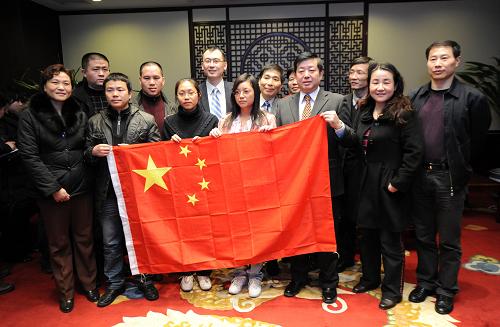 1月27日,中國公民在北京首都國際機場與外交部工作人員合影。當日,48名滯留海地的中國公民隨結束海地救援任務的中國國際救援隊乘包機安全抵達首都機場。新華社記者 金良快 攝