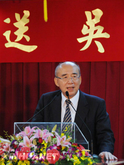 吳伯雄在茶會(huì)上致詞(10月14日攝)。10月14日,中國(guó)國(guó)民黨主席吳伯雄在臺(tái)北主持召開(kāi)任內(nèi)最后一次中常會(huì),為自己的黨主席生涯畫(huà)下句點(diǎn)。國(guó)民黨中央當(dāng)日為吳伯雄舉行歡送茶會(huì)。在17日舉行的國(guó)民黨第十八次全體代表大會(huì)上,吳伯雄將與馬英九完成黨主席職務(wù)交接。新華社記者 陳斌華攝