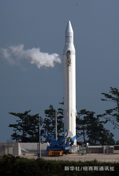 圖為8月19日在韓國南部全羅南道高興郡外羅老島羅老宇航中心拍攝的韓首枚運載火箭“羅老”號。韓國首枚運載火箭“羅老”號19日在預定發射時間17時(北京時間16時)前7分56秒被宣布中止發射。新華社/紐西斯通訊社