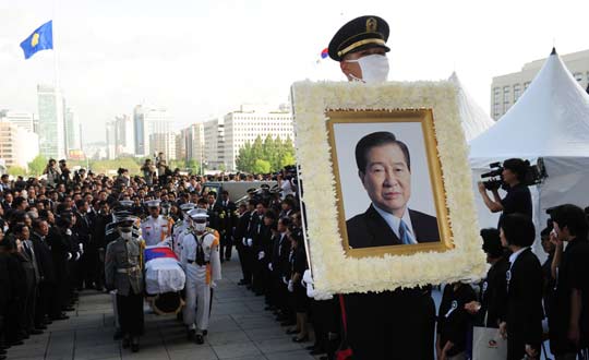 金大中的遺體20日入殮后,被運往設有正式靈堂的國會。當天下午4時20分許,靈車從Severance醫院出發,行車10多分鐘后抵達國會。靈柩被安置在國會大樓前設置的靈堂,韓國國會議長金炯旿和副議長李允盛,首先進行了吊唁。