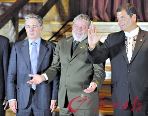 8月28日,哥倫比亞總統(tǒng)烏里韋(左)一臉疲憊。圖為烏里韋、巴西總統(tǒng)盧拉(中)與厄瓜多爾總統(tǒng)科雷亞在南美洲國家聯(lián)盟特別首腦會議上。