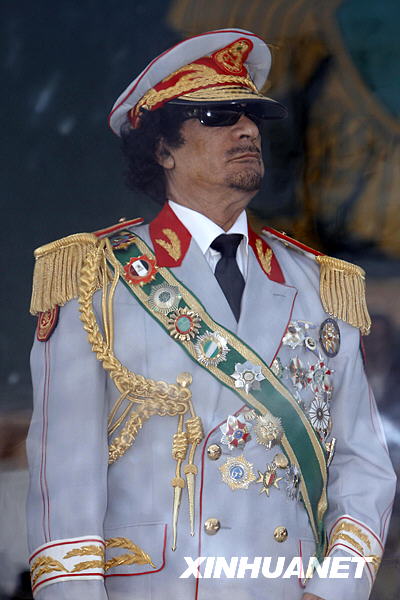 9月1日,在利比亞首都的黎波里,利比亞領(lǐng)導(dǎo)人卡扎菲檢閱利比亞革命40周年閱兵儀式。新華社發(fā)(哈姆宰·圖爾克攝)