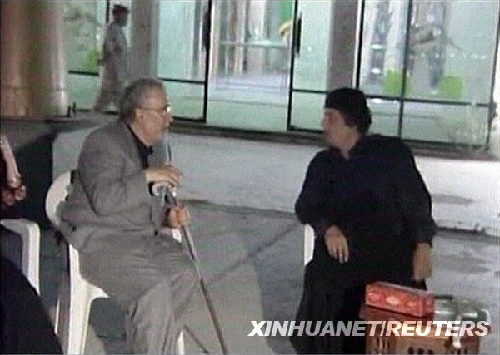 這張8月21日的視頻截圖顯示,利比亞領(lǐng)導(dǎo)人穆阿邁爾卡扎菲(右)在利比亞首都的黎波里與提前獲釋回國的洛克比空難制造者邁格拉希交談。邁格拉希身患晚期前列腺癌,經(jīng)過利比亞官員與蘇格蘭司法部門的協(xié)商,邁格拉希提前結(jié)束在蘇格蘭的刑期。美國白宮發(fā)言人吉布斯21日抨擊利比亞方面為提前獲釋回國的洛克比空難制造者邁格拉希舉行歡迎活動。新華社/路透