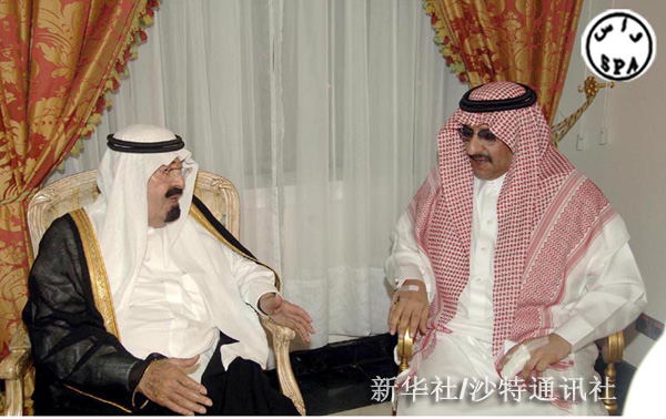 8月28日,沙特阿拉伯國王阿卜杜拉(左)在吉達醫院探望負責安全事務的內政部次大臣穆罕默德·本·納伊夫親王。