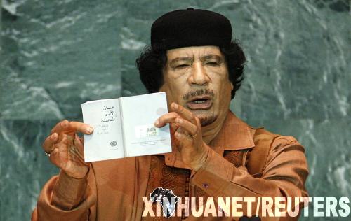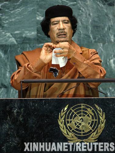 9月23日,利比亞領(lǐng)導(dǎo)人穆阿邁爾·卡扎菲在聯(lián)合國大會一般性辯論上發(fā)言時,佯裝要撕毀《聯(lián)合國憲章》。卡扎菲23日在第64屆聯(lián)大一般性辯論中發(fā)言說,必須在國際政治中實行民主,對聯(lián)合國及安理會實行改革,真正實現(xiàn)各國在聯(lián)合國的平等地位。這是卡扎菲執(zhí)政40年來首次來到紐約聯(lián)合國總部并在聯(lián)大一般性辯論中發(fā)言。新華社/路透