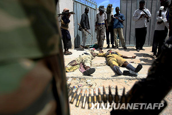 2009年7月13日,在索馬里首都摩加迪沙,反政府武裝聚集在交火中被打死的2名警察周圍。索馬里政府軍12日在首都摩加迪沙北部與反政府武裝交火,擊斃40名反政府武裝人員。政府軍死亡3人。新華社/法新