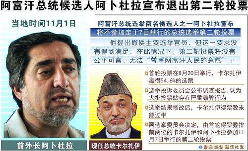 卡爾扎伊對手阿卜杜拉·阿卜杜拉1日以懷疑選舉公正性為由宣布退出第二輪總統(tǒng)選舉,使卡爾扎伊成為第二輪選舉唯一候選人。