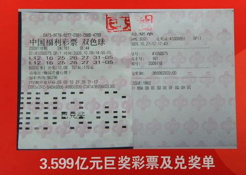2009年10月8日晚,中國福利彩票雙色球第2009118期開獎,當期全國共中出一等獎93注,每注獎金409.07萬元,其中河南省彩民一舉獲得88注一等獎,累計獲得獎金3.599億元,創造了新中國彩票發行以來單張彩票獲頭獎金額最高的新記錄。