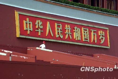 今天距離國慶六十周年還有整整五十天,國慶大閱兵即將拉開帷幕,新華門、天安門以及長安街正在有條不紊地進行著“變臉”工程。刷墻、上漆、貼金、修門、鋪磚、翻新燈座,到處都能看到施工者忙碌的身影,聽到“呲呲嚓嚓”的機械聲。