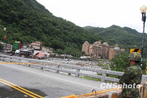 重災(zāi)區(qū)之一的臺(tái)東縣知本溫泉區(qū),一名士兵在橋畔守望斷樓。 中新社發(fā) 董會(huì)峰 攝