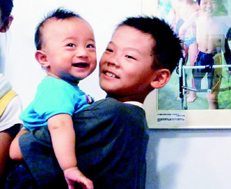 十二歲的顥顥(右)因骨癌右腿裝上義肢,老師與媽媽捕捉他參加游泳比賽的燦爛笑容,獲“捕捉希望”比賽癌友親友及社會大眾組第一及第二名。圖片來源:臺灣《聯合報》