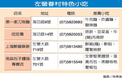 高雄市左營眷村陸續拆遷改建,但竹籬笆內的南北小吃仍保留原味,左營大路與海功路一帶的“第一家刀削面”、“南昌包子饅頭”、“上海醉雞、鵝及蘿卜絲”,以及“吃吃看餡餅、烙餅店”等,都讓人回味無窮。