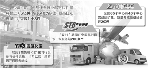 從空中到陸地,備戰“雙11”,加碼硬件幾乎成為各家快遞公司的“標配”。中通快遞副總裁倪根炎給出了一連串數字:金華、合肥、東莞、鄭州、南京,中通5個自有產權的分撥中心將在“雙11”前投入使用。全國65個中心有40個中心完成改擴建,為滿足今年“雙11”分揀需求,今年新增分揀設備投資近2億元,新增臨時操作用工5000人。