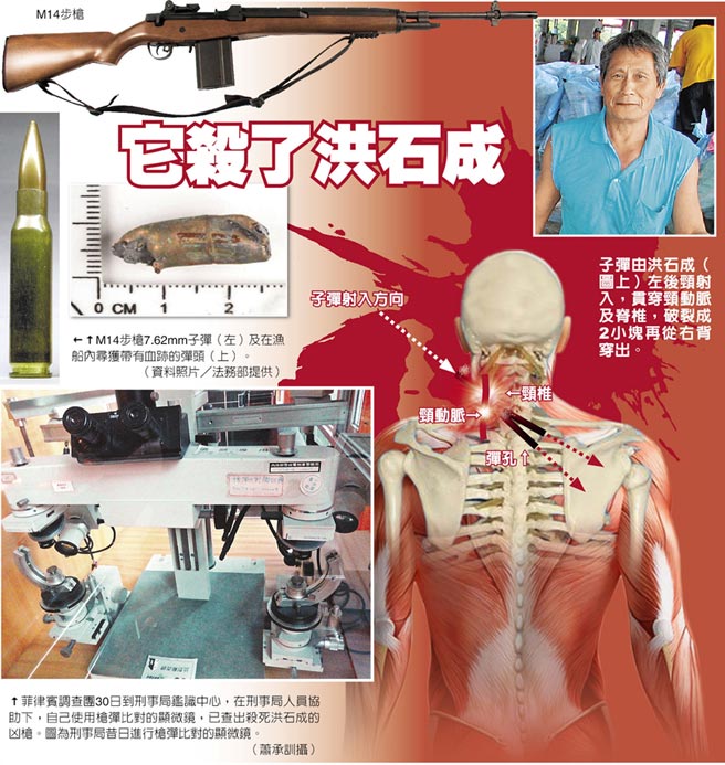 昨天結(jié)果出爐,初步認(rèn)定洪石成遭M14射擊死亡,海監(jiān)船上有7把類似步槍,經(jīng)彈道比對(duì),確定是其中一把射擊。M14步槍所用子彈屬大彈頭,有效射程在600米以上,威力強(qiáng)大。