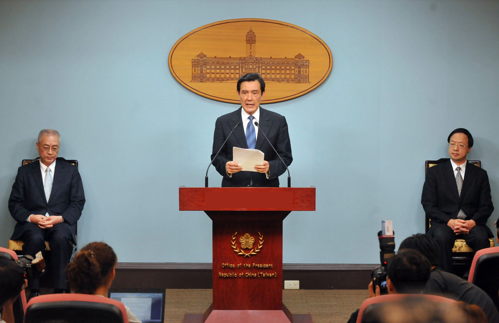 馬英九9月8日在其官邸召開(kāi)記者會(huì),稱王金平涉入司法關(guān)說(shuō)案是臺(tái)灣民主法治發(fā)展上“恥辱的一天”,作為臺(tái)灣地區(qū)領(lǐng)導(dǎo)人,他無(wú)從回避,必須挺身而出,捍衛(wèi)臺(tái)灣民主法治。左為臺(tái)灣地區(qū)副領(lǐng)導(dǎo)人吳敦義、右為臺(tái)“行政院長(zhǎng)”江宜樺。(圖片取自網(wǎng)絡(luò))