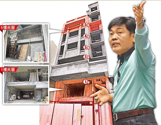 書記官楊金池與妻子申請興建5層獨立住宅,卻在1樓與5樓蓋非法夾層(白框處),讓5樓變7樓。(臺媒圖)