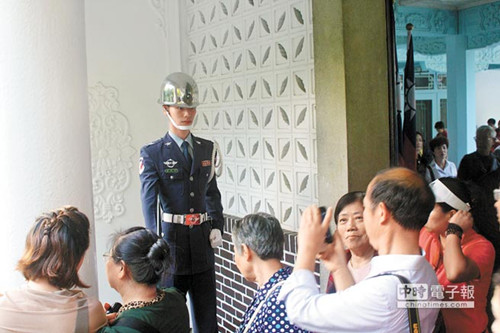 參訪團參觀慈湖兩蔣文化園區(qū)衛(wèi)兵交接儀式。圖片來源:臺灣《旺報》