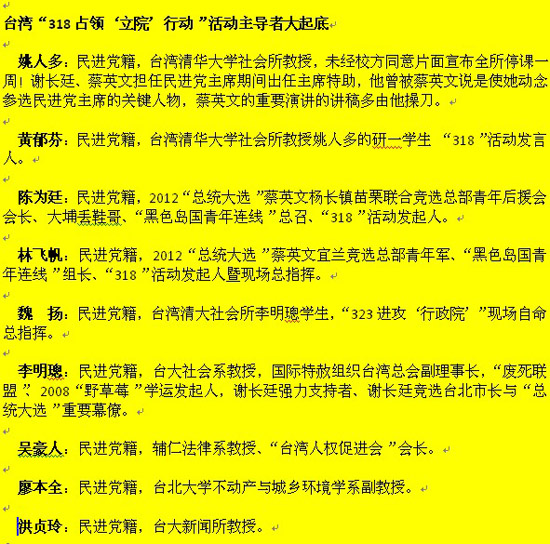 中國臺灣網3月28日消息 近日,來自臺北的學生簡俊義在網絡上發文曝光了318參與學運的主要學生名單及簡歷。記者從公布的23名主導者信息中留意到,竟有22名為民進黨籍,兩名是所謂的“反中”激進派成員。這讓人很難不與民進黨的政治訴求聯系起來。簡俊義更在文中自嘲:“教授與學生身份真好用!請跟我說這是不是政黨操弄。”