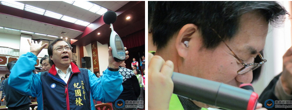 日前審查服貿過程中,民進黨播放高分貝音樂,藍營“立委”紀國棟(左)拿出分貝器,連綠營“立委”李應元(右)也受不了戴上耳塞。(臺媒圖)