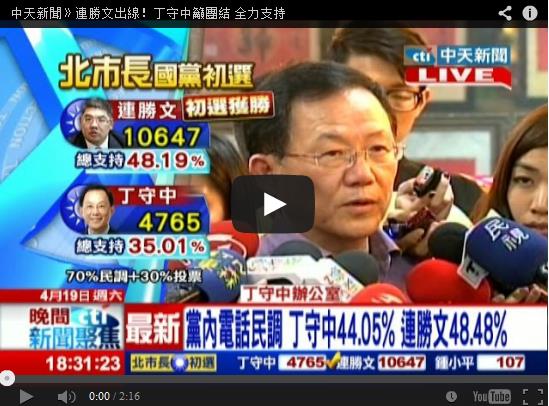 總支持率方面,連勝文48.19%,勝丁守中的35.01%。(中國臺灣網 王文英)