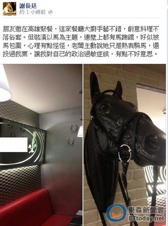 中國臺灣網6月1日消息 據臺灣“東森新聞”報道,2008年曾與馬英九角逐大位的前臺當局“行政院長”謝長廷,31日下午在臉書發文,指自己去一間以“馬”作為裝潢主題的餐廳用餐,不過,看見周圍都是馬的裝飾,感覺就像是“被馬包圍”,內心不禁有點怪怪。但餐廳老板主動示意,表示曾投票給他,謝對于自己的“政治過敏癥”感到不好意思。
