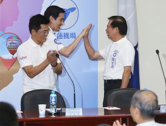 國民黨中常會上馬英九和候選人擊掌造勢。(圖片來源:臺灣《聯合報》)
